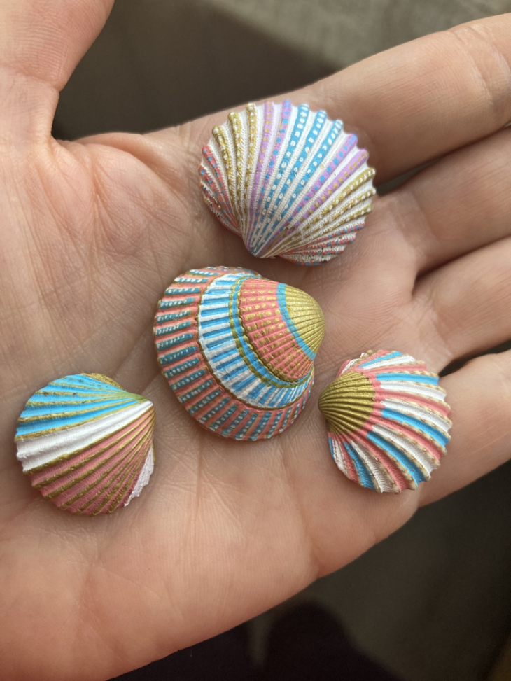 Lilie utilise également des pierres et des coquillages comme supports, transformant ces objets naturels en pièces d’art uniques.