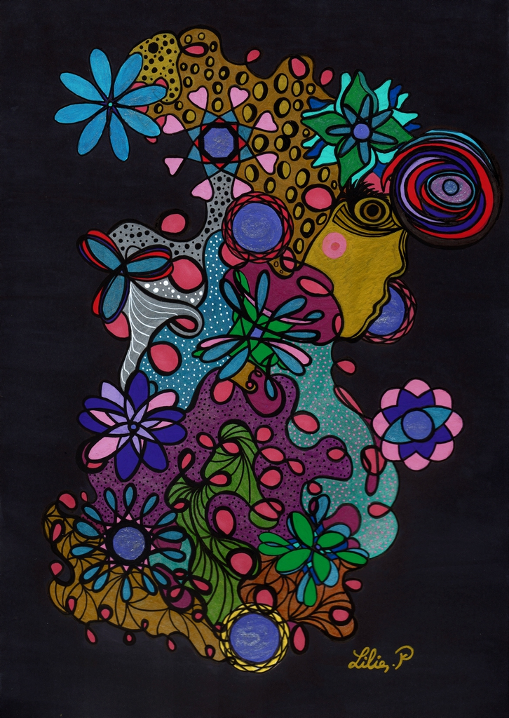 Elle est également une artiste visuelle douée, créant des oeuvres visuelles sur papier, toile et cailloux. Aquarelle, marqueur, peinture acrylique sont autant de techniques qui permettent à Lilie d'exprimer autrement qu'en musique.
